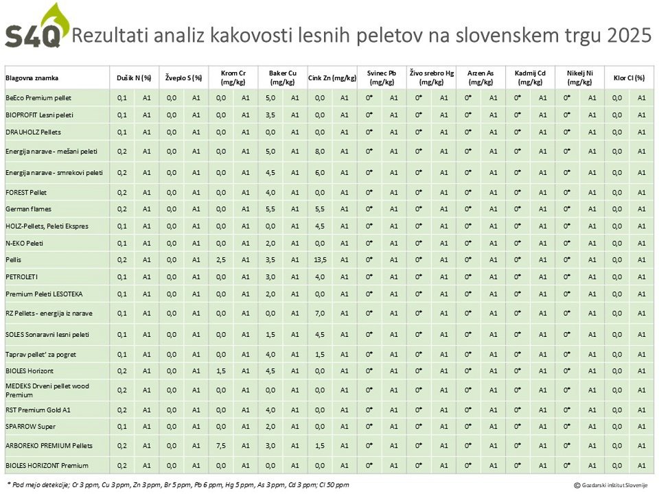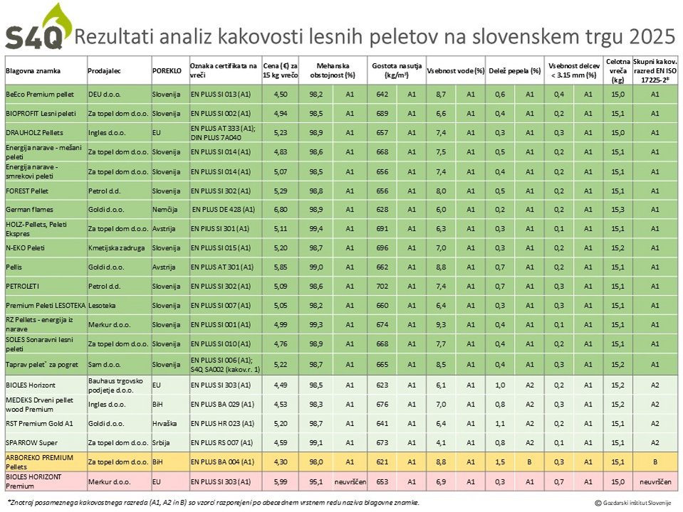 Zbrani rezultati analize peletov na slovenskem trgu so predstavljeni v preglednici 1. Znotraj posameznega kakovostnega razreda (A1, A2 in B) so vzorci razporejeni po abecednem vrstnem redu naziva blagovne znamke. Rezultati analiz iz preteklih let so objavljeni na spletni strani S4Q (https://wcm.gozdis.si/sl/s4q/kakovost-pelet-v-sloveniji/).