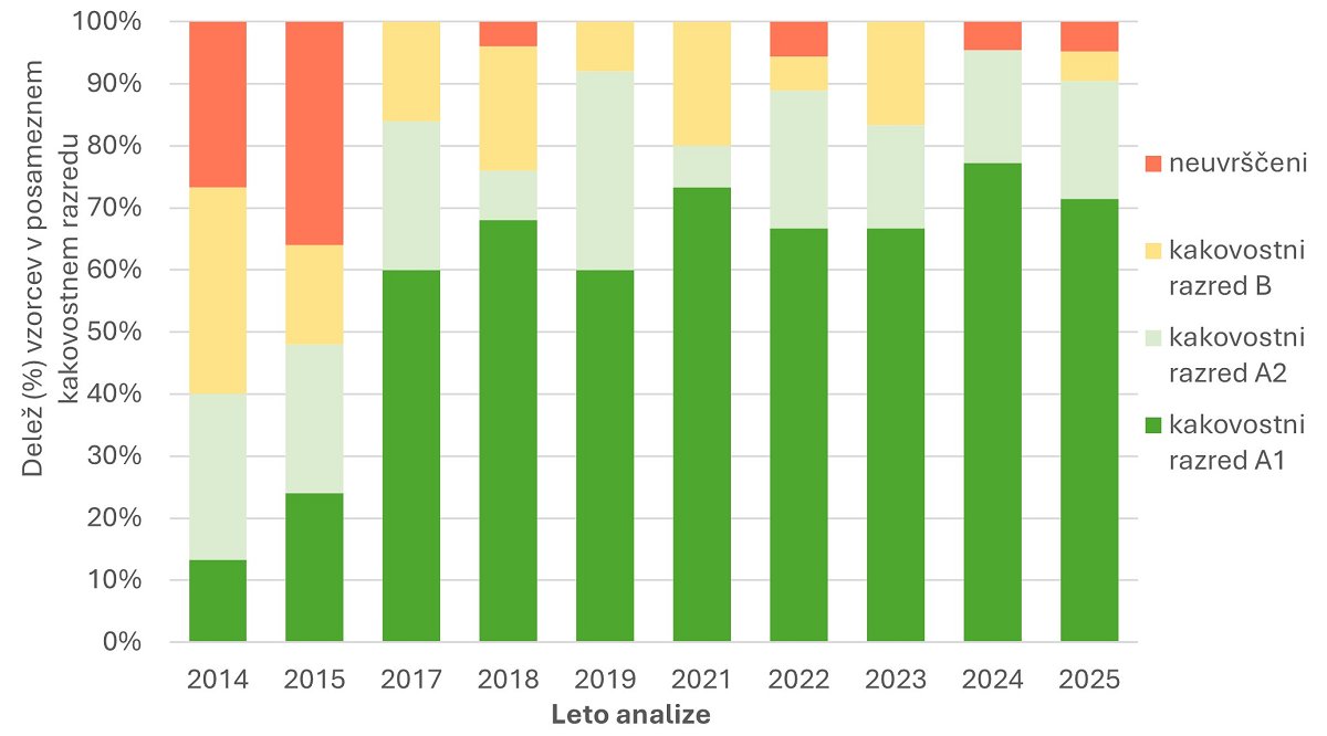 Ugotavljamo, da je zadnja leta delež vzorcev, uvrščenih v kakovostni razred A1, naraščal in je glede na analize v letih 2014 in 2015, ko smo začeli testiranja, zelo visok. V zadnjih dveh letih so bili v analize vključeni le vzorci kakovostnega razreda A1. Kar kaže tudi na to, da se je na trgu povečala ponudba najboljših peletov ter da je na trgu dostopnih vse več certificiranih peletov. Žal pa v letošnji analizi ponovno enega vzorca zaradi slabe kakovosti nismo mogli razvrstiti v kakovostne razrede.