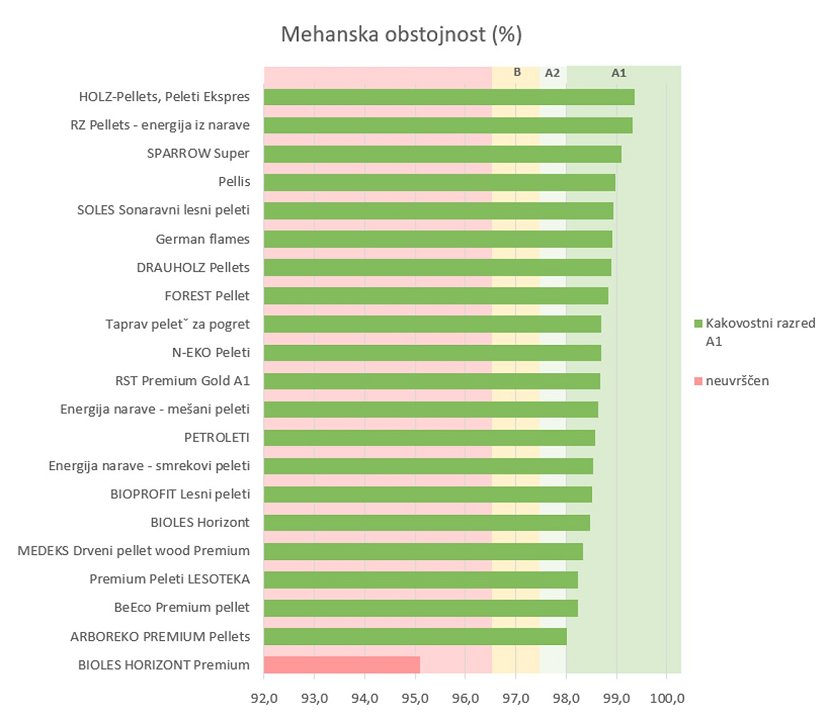 Stanje se je glede na preteklo analizo nekoliko poslabšalo, saj imamo manj vzorcev, uvrščenih v kakovostni razred A1, kljub temu da na embalaži vsi proizvajalci zagotavljajo kakovost A1, in le to potrjujejo s certifikati Enplus. Po opravljenih analizah smo 15 vzorcev razvrstili v kakovostni razred A1, štirje so se uvrstili v A2, en vzorec v B, enega vzorca pa ni bilo mogoče razvrstiti v kakovostni razred.