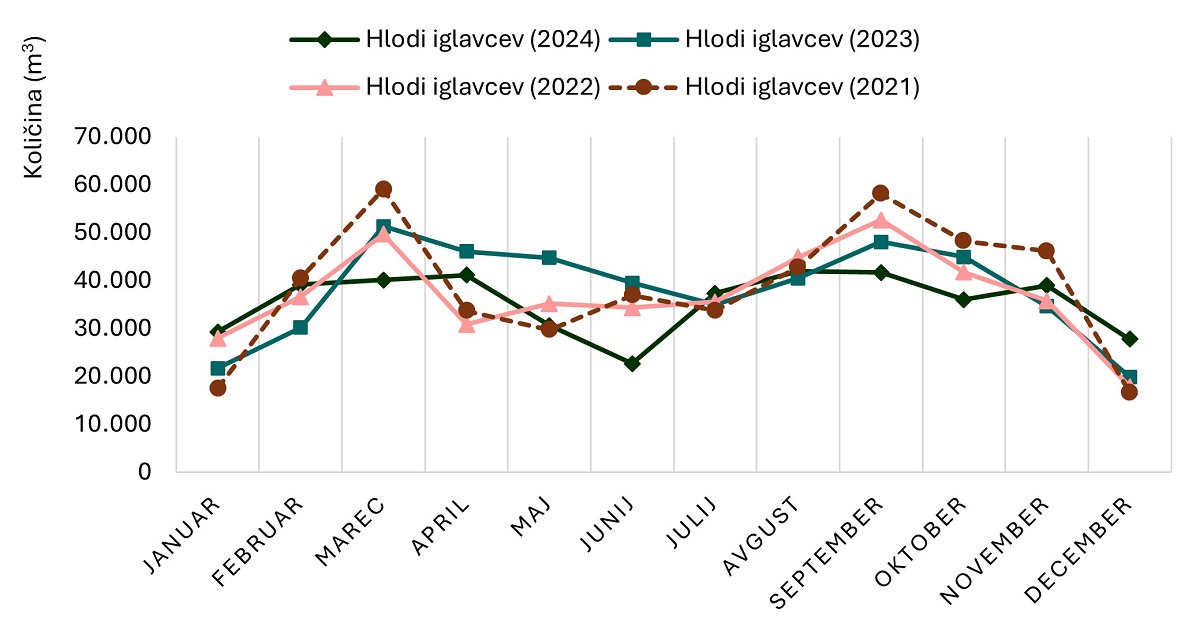 Mesečna dinamika odkupa iz zasebnih gozdov se med posameznimi skupinami GLS razlikuje; v prispevku prikazujemo značilnosti mesečnega odkupa hlodov za žago in furnir iglavcev, ki prevladuje v strukturi odkupa GLS iz zasebnih gozdov. V letu 2024 je bil najmanjši odkup hlodov iglavcev zabeležen junija (5 % celotnega letnega odkupa), kar odstopa od trenda preteklih let, ko je bil najnižji odkup običajno dosežen v decembru in januarju. V primerjavi z junijem leta 2023 se je odkup hlodovine iglavcev v juniju zmanjšal za 43 %. Dinamika mesečnega odkupa hlodovine iglavcev v letu 2024 je v primerjavi s prejšnjimi leti bolj stabilna in enakomerna, kar se kaže v manj izrazitem sezonskem nihanju med spomladanskim in jesenskim vrhom. Največji odkup hlodovine iglavcev je bil v letu 2024 zabeležen avgusta in septembra, sledita meseca april in marec. Skupno je odkup v teh mesecih predstavljal 39 % vseh evidentiranih odkupljenih količin hlodov iglavcev iz zasebnih gozdov v letu 2024.