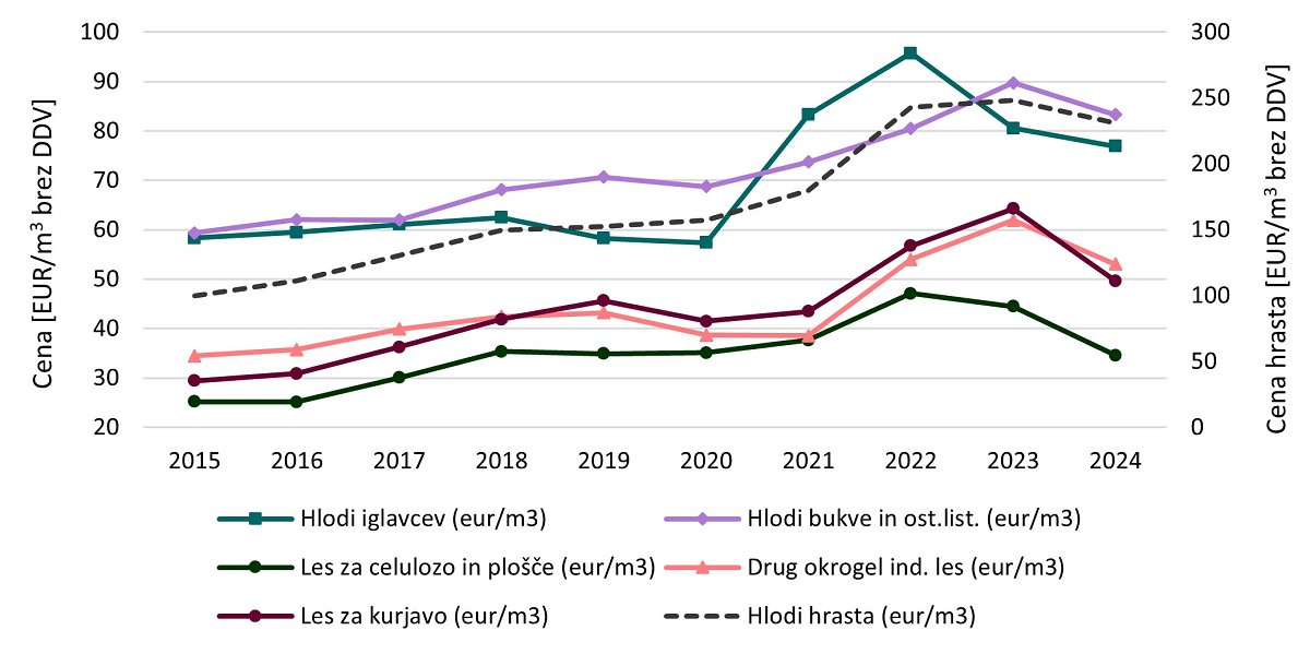 Po podatkih SURS so se povprečne letne odkupne cene v letu 2024 znižale za večino skupin GLS v primerjavi z letom 2023; edino zvišanje (+8 %) je bilo zabeleženo v skupini lesa za kurjavo iglavcev. V primerjavi z letom 2023 se je povprečna letna odkupna cena v 2024 najbolj znižala pri lesu za celulozo in plošče listavcev, in sicer za 25 %. Sledila je kategorija lesa za kurjavo listavcev, kjer je cena upadla za 22 % in je v letu 2024 znašala 52,06 EUR/m³. Cena hlodov iglavcev, ki v strukturi odkupa količinsko predstavlja največji delež, je v letu 2024 znašala 76,88 EUR/m³, kar je 5 % manj v primerjavi z letom 2023. Povprečna odkupna cena hlodovine hrasta je v letu 2024 znašala 231,20 EUR/m3, kar je 7 % manj kot leta 2023, pri hlodih bukve pa je bila povprečna odkupna cena 86,73 EUR/m3 (-3 % v primerjavi z letom 2023). Cene lesa za celulozo in plošče med leti nihajo, pri iglavcih se je cena v obdobju 2018–2021 gibala okoli 30 EUR/m3, pri čemer je dosegla maksimum leta 2022 (40,63 EUR/m3), v letu 2024 pa smo se ponovno vrnili na raven 30,10 EUR/m3. Pri listavcih je bila povprečna cena lesa za celulozo in plošče v letih 2020 in 2021 stabilna, gibala se je okrog 43 EUR/m3. Leta 2023 je dosegla svoj maksimum s 60,17 EUR/m3, v letu 2024 pa se je ponovno znižala na 45,22 EUR/m3. Povprečna letna cena lesa za kurjavo iglavcev je od leta 2022 ostala stabilna, v letu 2024 pa je znašala 31,90 EUR/m3. Pri listavcih pa se je rekordna cena iz leta 2023 (66,75 EUR/m3) znižala in je v letu 2024 znašala 52,06 EUR/m3.