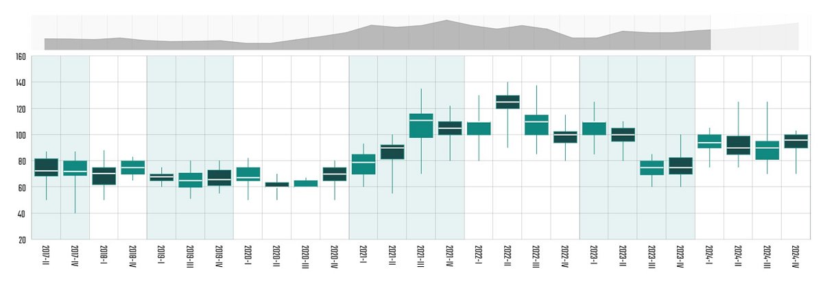 Tudi GIS, ki v sredini posameznega četrtletja zbira in vodi odkupne cene GLS po kakovostnih razredih, je v letu 2024 zaznal znižanje cen pri večini GLS. Edino zvišanje cen je bilo zabeleženo pri hlodih hrasta, vseh kakovostnih razredov z izjemo najnižjega (D) in ti dosegajo rekordno vrednost. Zvišanje je bilo zabeleženo še pri hlodih smreke, saj je povprečna cena v letu 2024 za 2 % višja od cene v letu 2023. Cene hlodov smreke, jelke in rdečega bora so sicer primerljive z letom 2021. Srednja vrednost hlodov smreke kakovostnega razreda A je v letu 2024 znašala 131 EUR/m3, kakovostnega razreda B 100 EUR/m3, kakovostnega razreda C 93 EUR/m3, kakovostnega razreda D1 72 EUR/m3 ter kakovostnega razreda D2 59 EUR/m3. Povprečna cena hlodov jelke je bila v letu 2024 za 11 EUR/m3 nižja od povprečne cene hlodov smreke, največja razlika je pri hlodih najboljše kakovosti (29 EUR/m3). Pri rdečem boru pa je povprečna cena hlodov za 27 EUR/m3 nižja od hlodov smreke, prav tako je največja razlika pri hlodih kakovostnega razreda A, in sicer 49 EUR/m3. Cene bukovih hlodov so tudi v letu 2024 ostale visoke, kljub temu da so se v povprečju znižale za 6 % v primerjavi z letom 2023. Pri tem so se najbolj znižale cene kakovostnega razreda D, katerega srednja vrednost je v letu 2024 znašala 69 EUR/m3. Cene hlodov hrasta so bile tudi v letu 2024 rekordne; najvišje smo zabeležili v avgustu, ko je srednja vrednost kakovostnega razreda F1 znašala 500 EUR/m3, najnižjega kakovostnega razreda D pa 110 EUR/m3. Za leto 2024 so bile značilne nizke cene industrijskega lesa namenjenega za proizvodnjo kompozitnih plošč, mehanske celuloze in kemikalij. Te so bile za celulozni les in brusni les iglavcev dokaj konstantne, pri lesu za plošče listavcev pa so se predvsem ob koncu leta izrazito znižale. V novembru je tako cena bukovega lesa za plošče znašala 43 EUR/m3 in je bila najnižja po maju leta 2020. V primerjavi z letom 2023 so se znižale tudi cene lesa za kurjavo; srednja vrednost je za bukev znašala 63 EUR/m3, za ostale trde listavce pa 53 EUR/m3, kar je v obeh primerih 11 % manj kot v letu 2023 in 5 % manj kot v letu 2022. Odkupne cene GLS, ki jih spremlja GIS, so ažurno objavljene na prosto dostopnem spletnem portalu WoodChainManager (WCM) / InfoGozd pod rubriko Podatki / Cene.