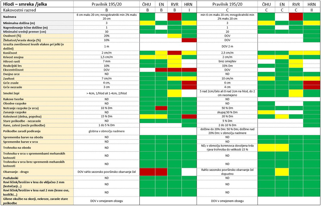 - Pravilnik Ur. l. št. 195/20 vsebuje najširši nabor kriterijev za razvrščanje hlodov v kakovostne razrede med vsemi primerjanimi sistemi;