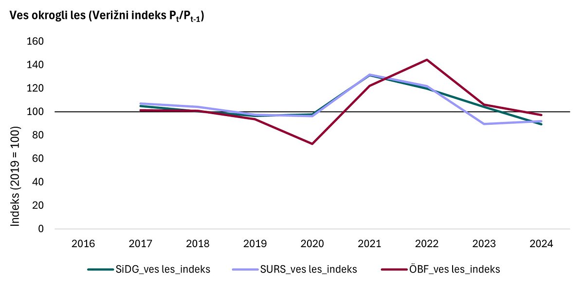 Na sliki 1 je prikazan splošni indeks cen gozdnih lesnih sortimentov s stalno osnovo, pri čemer je bazno leto 2019, in sicer za vse GLS skupaj. Pri izračunu so bili uporabljeni vhodni podatki o količini in vrednosti odkupa oziroma prodaje GLS za Slovenijo in Avstrijo. Prednosti tega scenarija so robusten prikaz dolgoročnega trenda gibanja povprečne cene, ki zajame celotno skupino okroglega lesa, relativno majhno število potrebnih vhodnih podatkov ter možnost hitrega in preglednega spremljanja cenovnih trendov tudi v mednarodnem kontekstu. Poleg tega scenarij omogoča primerjavo med vsemi podjetji, ki so zavezana k posredovanju podatkov v obliki letnih poročil, indeks pa ustrezno odraža uspešnost podjetij pri doseganju cen GLS. Njegova glavna pomanjkljivost je omejen vpogled v gibanje cen na ravni posameznih kakovostnih razredov hlodovine. Pri interpretaciji indeksa povprečne letne odkupne cene je zato nujno podrobneje upoštevati tudi strukturo sortimentacije in obseg sanitarnih sečenj, saj lahko oba dejavnika pomembno vplivata na končno povprečno odkupno ceno in posledično na vrednost indeksa.