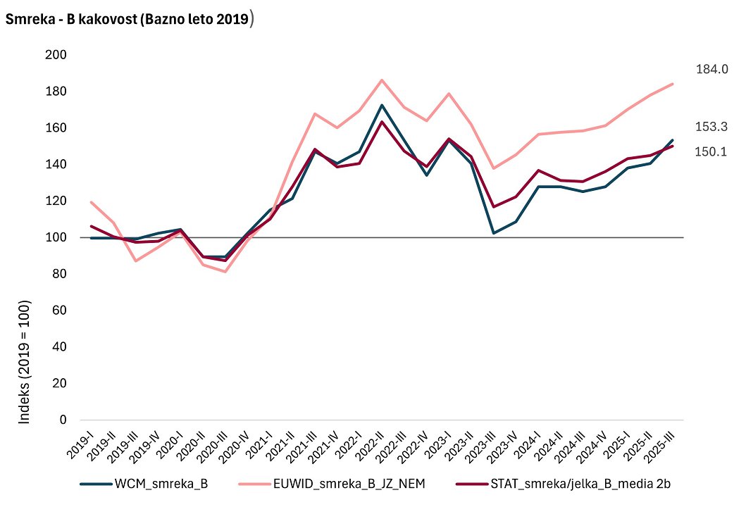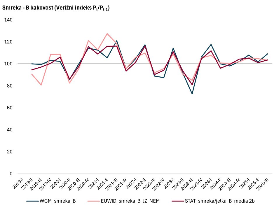 Indeksi cen hlodovine po kakovostnih razredih so primerni za primerjavo gibanja cen med različnimi ponudniki ter omogočajo bolj ažuren medletni vpogled v razmere na trgu GLS. Na sliki 3 podajamo primer indeksa s stalno osnovo za hlode smreke kakovostnega razreda B, ki primerja odkupne cene iz zasebnih gozdov v Sloveniji, Avstriji ter južnem in zahodnem delu Nemčije. Pri interpretaciji je potrebno upoštevati, da mejne vrednosti dimenzij in posameznih napak za razvrščanje v ta kakovostni razred med primerjanimi državami niso povsem enake.