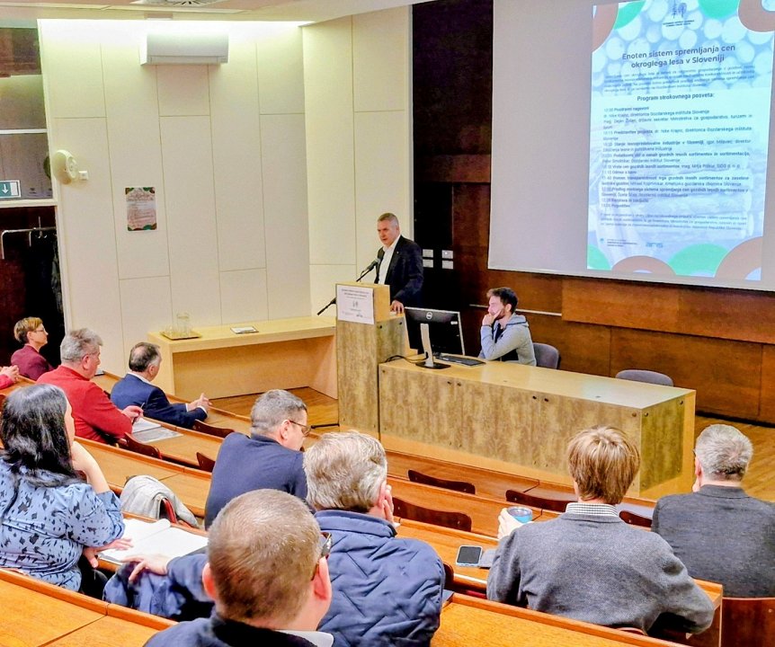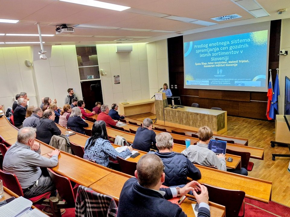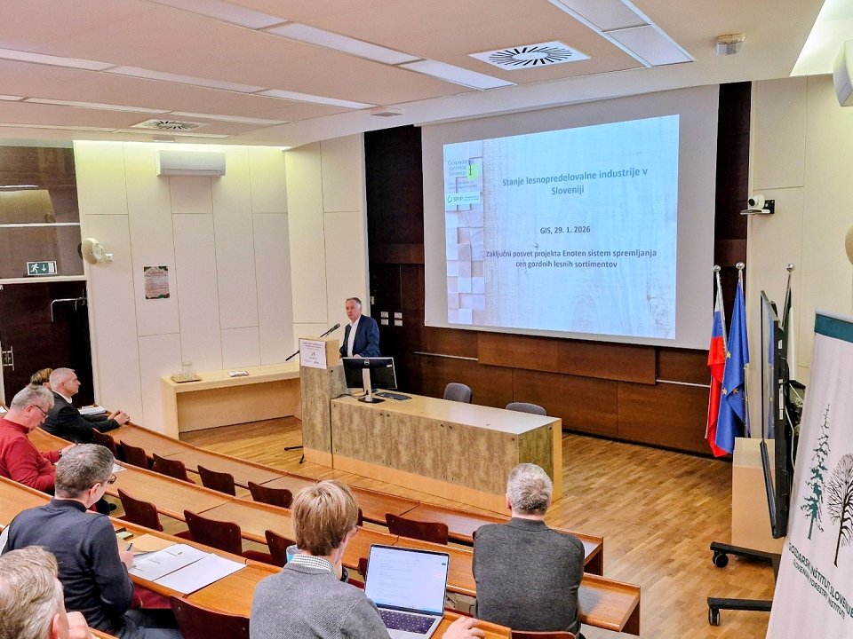 V četrtek, 29. januarja 2026, smo sodelavci Gozdarskega inštituta Slovenije, kot vodilni in edini partner ciljno–raziskovalnega projekta (V4-24017) z naslovom » Enoten sistem spremljanja cen gozdnih lesnih sortimentov « organizirali zaključni strokovni posvet, namenjen deležnikom gozdno–lesne verige z obravnavanega področja. Posvet je potekal v Ljubljani, na Gozdarskem inštitutu Slovenije. Program strokovnega posveta je pritegnil 59 udeležencev, večinoma podjetja, povezana z odkupom in predelavo okroglega lesa, državne institucije, interesna združenja ter sodne cenilce in izvedence. Namen srečanja je bil predstaviti dejavnike, ki vplivajo na ceno okroglega lesa, podatkovne vire in značilnosti cen okroglega lesa na evropski ravni, ter predlog objektivnega ter enotnega spremljanja trga okroglega lesa v Sloveniji in primerjanih evropskih državah. Zanimanje gozdarskih in lesnopredelovalnih podjetij potrjuje pomen transparentnosti trga okroglega lesa za strateško načrtovanje obsega in dinamike trženja v gozdno–lesnem sektorju.