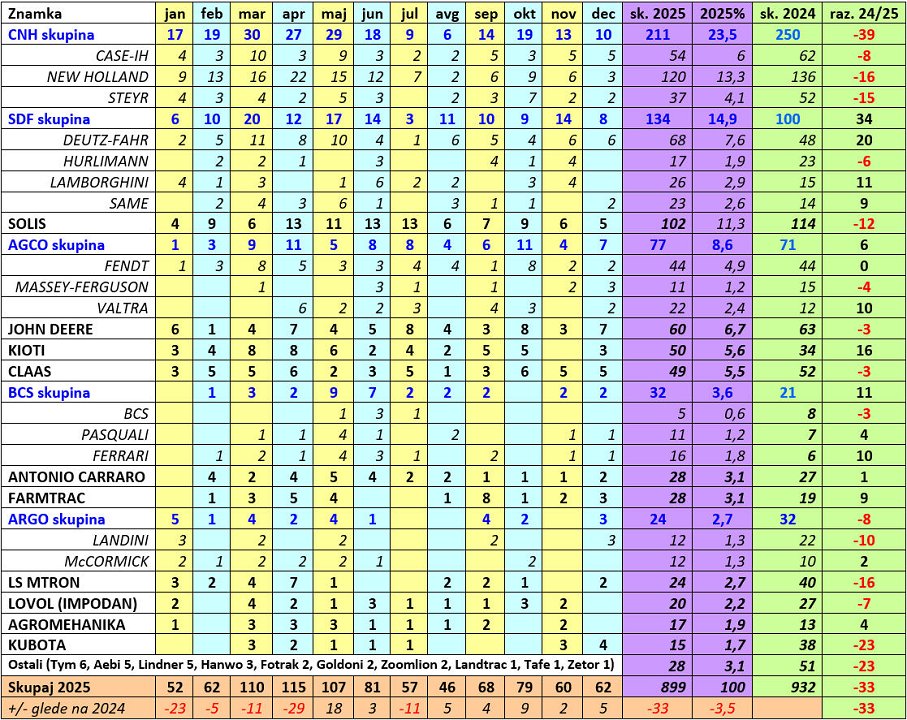 Tudi v letu 2025 je na vrhu skupina CNH, kot že vrsto let, na drugem mestu pa skupina SDF, a z manjšo razliko med njima, kot smo ji bili priča do sedaj, saj je bila prodaja po blagovnih znamkah znotraj skupin različna. V skupini CNH so pri vseh blagovnih znamkah prodali manj, kaj v seštevku pomeni 39 traktorjev manj. V skupini SDF pa so pri treh od štirih blagovnih znamka prodali več in skupaj 34 traktorjev več. Na tretjem mestu je blagovna znamka Solis, sledi pa skupina Agco. Pri Solisu so prodali nekaj manj, pri Agco pa skupaj nekaj več, so pa bili pri blagovnih znamkah znotraj skupine različno uspešni. Našteti dve skupini in Solis so edini, ki so lani prodali več kot 100 traktorjev. Z malenkost manjšo, a stabilizirano prodajo sledi John Deere, nato pa Kioti, ki se je s povečano prodaj precej pomaknil naprej. Sledi Claas, skupina BCS itn. V preglednici so navedeni podatki za vse skupine in blagovne znamke. V zadnjih dveh stolpcih so primerjalni podatki z letom 2024.