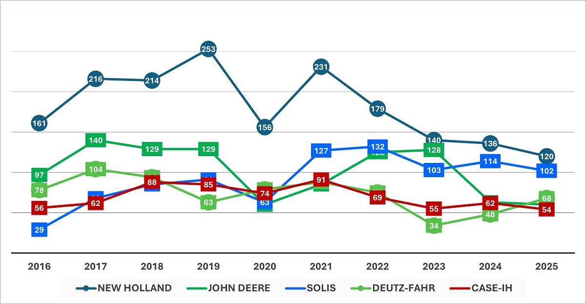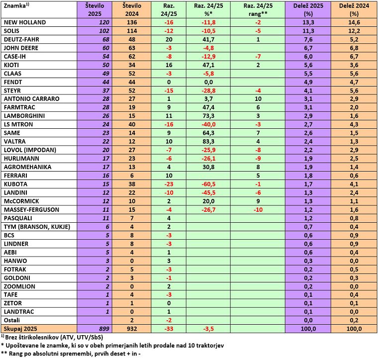 Ne glede na zmanjšanje prodaje (minus 16) New Holland ostaja na prvem mestu po prodaji tudi v letu 2025 in skupaj z drugim in Solisom (minus 12) so edini, ki so lani prodali nad sto traktorjev. Razlika tretjega Deutz-Fahr in četrtega John Deere je kar velika, nad 50 %. Najbolj se je po lestvici navzgor pomaknil Deutz-Fahr, in sicer za 4 mesta. Case-IH je mesto nižje kot lani, za njim pa je Kioti, ki se je dvignil za 3 mesta. Sledijo Claas, Fendt, Antonio Carraro itn.
