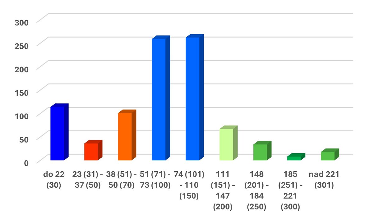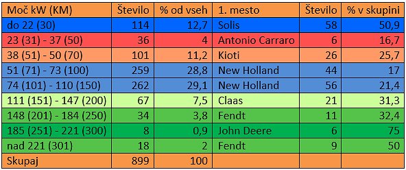 Pripravili smo tudi pregled števila prodanih traktorjev po skupinah moči. Kakor je vidno v preglednici, je bilo tudi v letu 2025 največ prodanih traktorjev v skupinah moči od 51 do 150 KM (od 38 do 110 kW). V preglednici smo navedli tudi katera blagovna znamka je bila najuspešnejša v posamezni skupini moči, koliko traktorjev v tej skupini so prodali in kolikšen odstotek predstavlja to število od vseh traktorjev v skupini. Za boljšo predstavo smo pripravili tudi grafikon s prikazom prodanih traktorjev po skupinah moči. Tako v preglednici, kot v grafikonu smo posamezne skupine obarvali s približnimi barvami blagovne znamke z najboljšo prodajo v tej skupini.