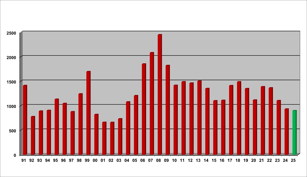 Pregled prodaje novih traktorjev v letu 2025, ki smo ga pripravili na osnovi podatkov o registriranih vozilih v posameznih mesecih, ki jih pripravlja in posreduje Ministrstvo za infrastrukturo, za kar se jim na tem mestu zahvaljujemo, zaključujemo s tradicionalno sliko, ki prikazuje prodajo novih traktorjev v Sloveniji od leta 1991 naprej. Lansko leto je bilo s prodajo 899 traktorjev na nivoju let 1993, 1994 in 1997 in prodaja je bila za 3,5 % ali 33 traktorjev manjša kot v letu 2024.