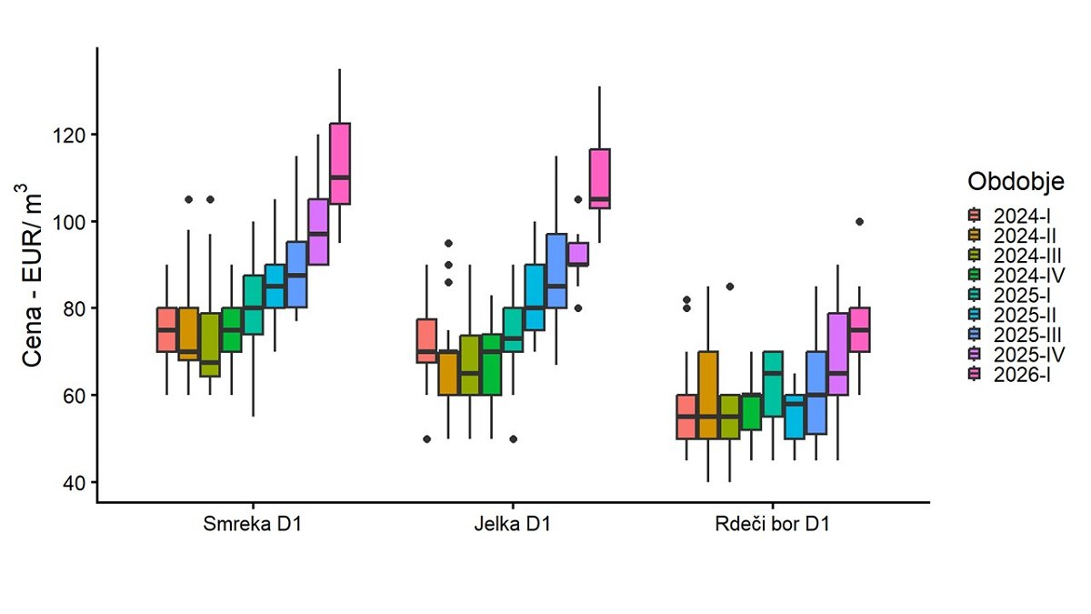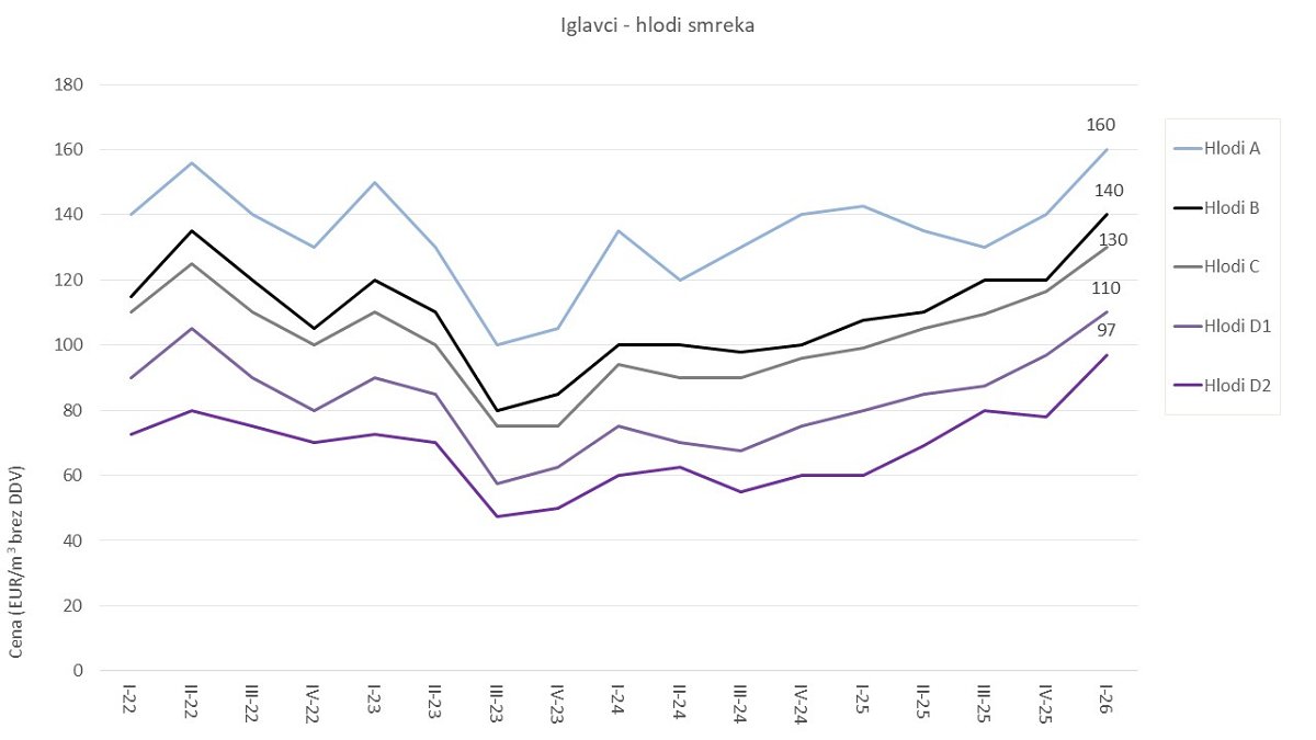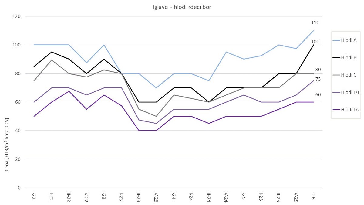 Cene hlodov iglavcev so se v februarju 2026 pri smreki, jelki in rdečem boru večinoma zvišale, v povprečju od 10 % do 16 % v primerjavi s cenami v novembru 2025. Glede na lanski februar pa so letošnje cene hlodovine iglavcev v povprečju višje za 32 %. Letošnje februarske cene za najkakovostnejša razreda hlodov rdečega bora so dosegle najvišje nominalne vrednosti doslej. Hlodovina smreke in jelke je dosegla rekordne vrednosti v vseh kakovostnih razredih.
