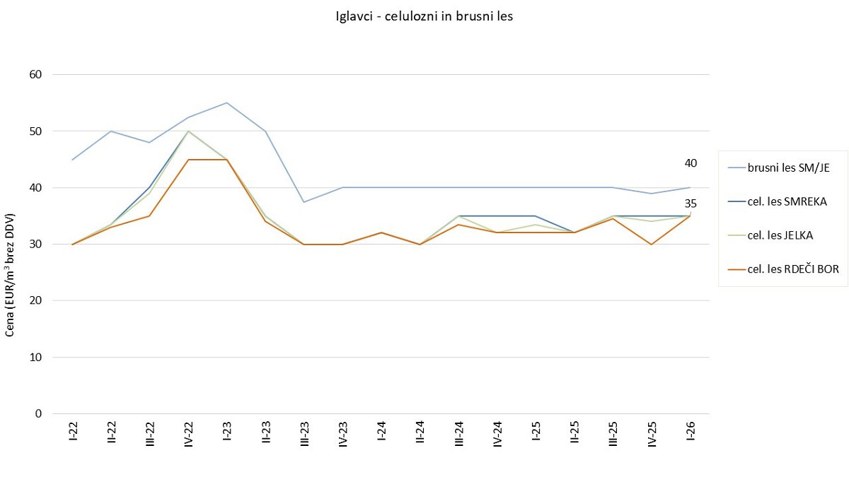 Srednja vrednost zbranih cen lesa za celulozo in plošče iglavcev je v februarju 2026 za vse tri spremljane vrste iglavcev (smreko, jelko in rdeči bor) znašala 35 EUR/m3. Cena je pri smreki enaka kot februarja lani, pri jelki je cena višja za 1 EUR/m3, pri rdečem boru pa za 3 EUR/m3.
