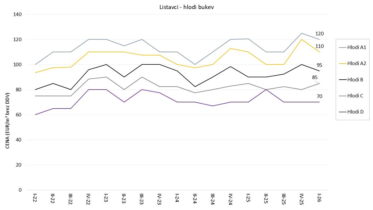Cene hlodovine listavcev so se v prvem četrtletju leta 2026 v primerjavi s preteklim zbiranjem v novembru 2025 pri bukvi večinoma znižale ali ostale enake, zvišala se je le cena kakovostnega razreda C (+6 %). Pri hrastu smo glede na november 2025 za večino kakovostnih razredov zabeležili padec ali stagnacijo cen, le kakovostni razred F1 in kakovostni razred D sta v povprečju beležila rahlo rast (+5 %). Glede na enako obdobje lansko leto so cene hlodov bukve v letošnjem februarju zelo primerljive- skoraj enake (v povprečju višje 1 %). Cena hlodov hrasta pa je v povprečju nižja 8 %, glede na lanski februar.