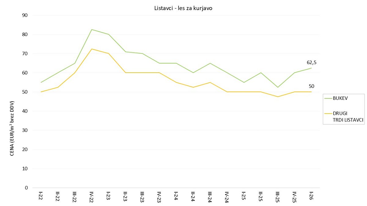 Srednja vrednost zbranih cen lesa za kurjavo se je v letošnjem februarju v primerjavi s cenami v novembru 2025, v primeru bukovine zvišala in je znašala 62,5 EUR/m3, v primeru drugih trdih listavcev pa je ostala enaka in je znašala 50 EUR/m3. V primerjavi s cenami v enakem obdobju lansko leto je letošnja februarska cena bukovega lesa za kurjavo višja za 14 %, v primeru drugih trdih listavcev pa ostaja enaka.